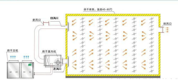 空氣能烘干機是利用逆卡諾原理,吸收空氣中的熱量并將其轉移到烘干庫房內,實現烘干房的溫度提高,配合相應的除濕排濕設備實現物料的干燥。熱泵干燥機由壓縮機--換熱器(內機)--節流器--吸熱器(外機)--壓縮機等裝置構成了一個制冷劑循環系統。冷媒在壓縮機的作用下在系統內循環流動,它在壓縮機內完成氣態的升壓升溫過程(溫度高達120℃),它進入內機釋放出高溫熱量加熱烘干房內空氣,同時自己被冷卻并轉化為流液態,當它運行到外機后,液態迅速蒸發吸熱再次轉化為氣態,同時溫度下降至-20℃~-30℃,這時吸熱器周邊的空氣就會源源不斷地將熱量傳遞給冷媒。冷媒不斷地循環就實現將空氣中的空氣溫度達到干燥物料的目的。
